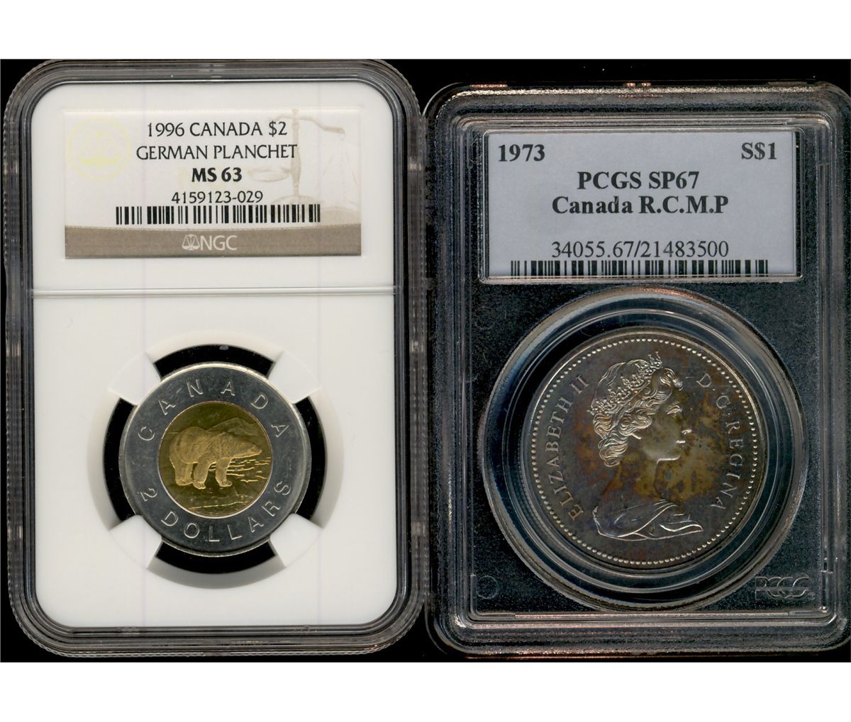 1973 $1 RCMP PCGS PR67 & 1996 $2 German Planchet NGC63.