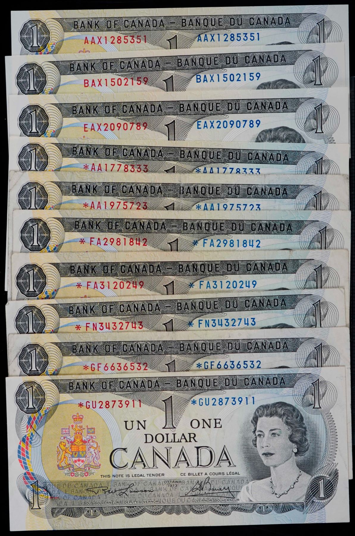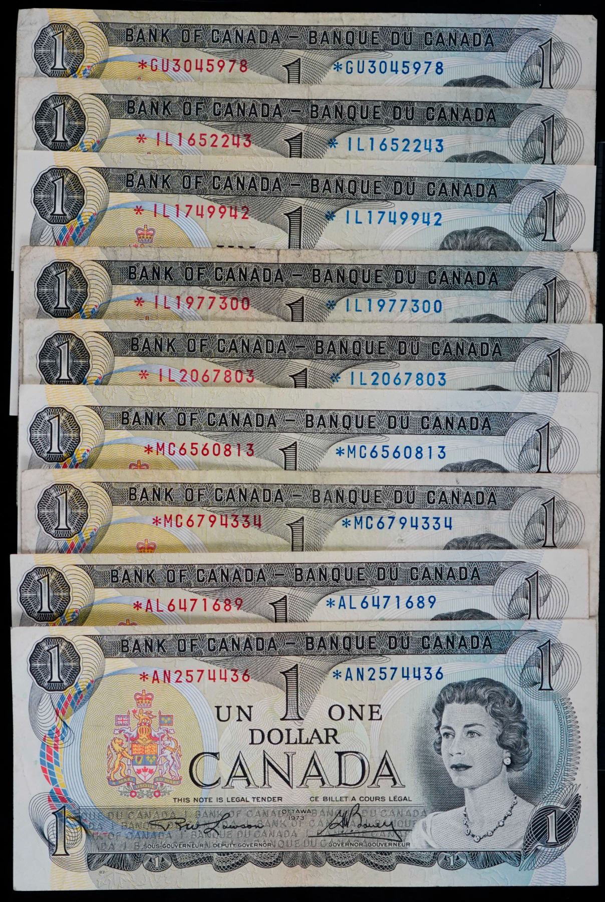 1973 $1 Replacement Lot; Includes various signatures, prefix. Some better ones. Fine to Gem Unc. Lot of 19 notes.