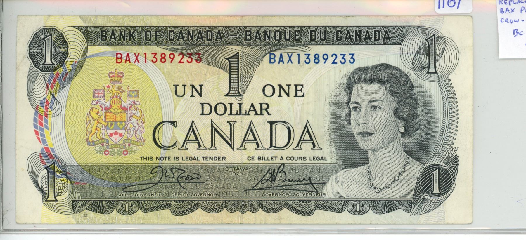 1973 $1 Replacement note. Crow-Bouey signatures. BAX Replacement Prefix. BC-46bA. VF-20.