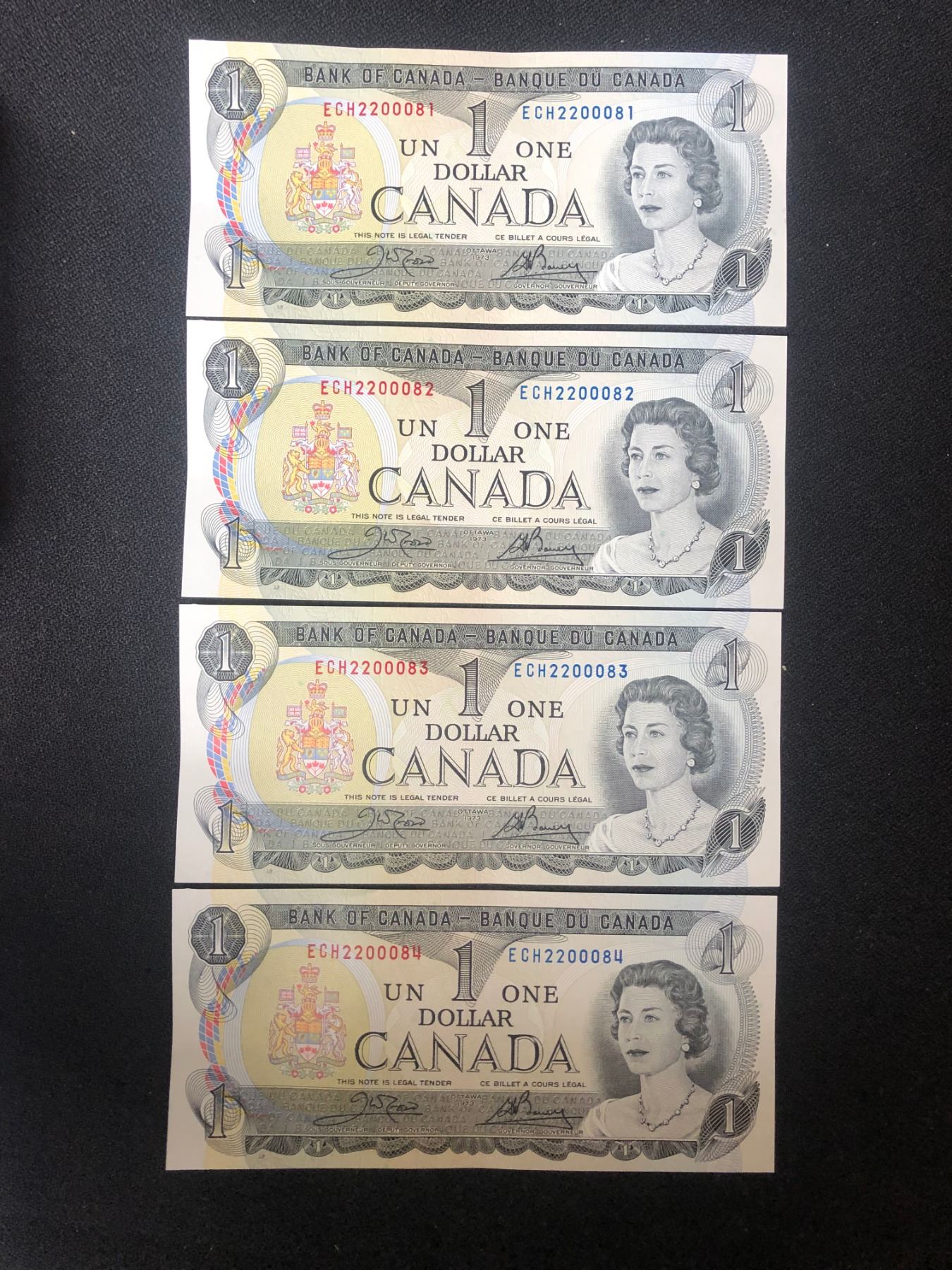 1973 $1 UNCIRCULATED SEQUENTIAL CANADIAN BANK NOTES