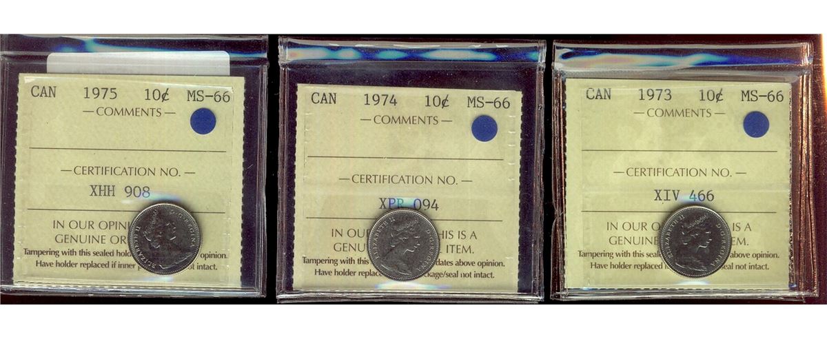 1973 10¢, 1974 & 1975 ICCS MS66. Lot of 3 coins.