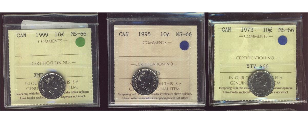 1973 10¢, 1995 & 1999 ICCS MS66. Lot of 7 coins.