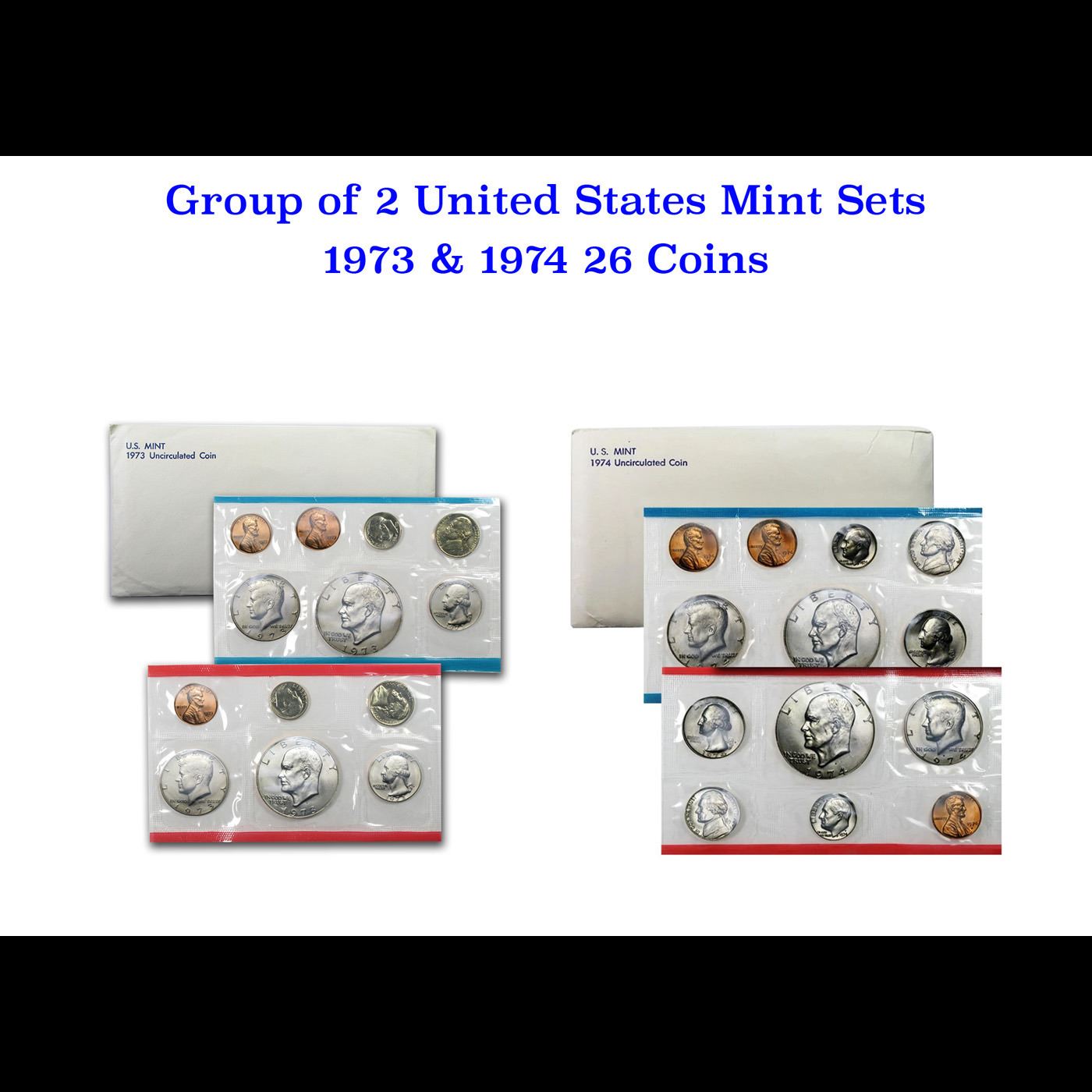 1973-1974 United States Mint Set. Although first struck in 1971, the Ike dollar did not appear in a mint set until 1973 — and oddly enough, it would turn out that the only place to find said Eisenhower would be within the year's uncirculated set as none were produced for circulation. With a production of less than 1.8 million, the 13-coin 1973 mint set claimed the lowest output of the 1970s. An already low mintage coupled with the dismantlement of complete sets for individual Ike dollars means that far fewer remain intact for collectors today. We've paired the desirable 1973 mint set with the next 13-coin 1974 issue for a total of 26 coins; each contains Philadelphia and Denver specimens of the cent through dollar as well as an additional San Francisco penny.