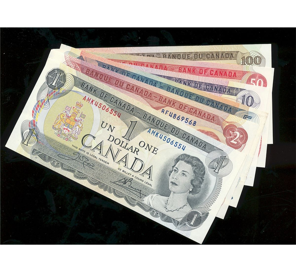 1973-1975 Multi Colour Note Set; includes 1973 $1, 1974 $2, 1972 $5, 1971 $10, 1969 $20, 1975 $50 & 1975 $100. All notes UNC.