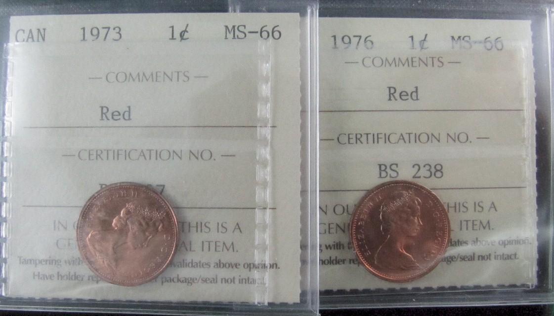 1973 & 1976 1¢ ICCS MS66RD. Lot of 2 gem coins.