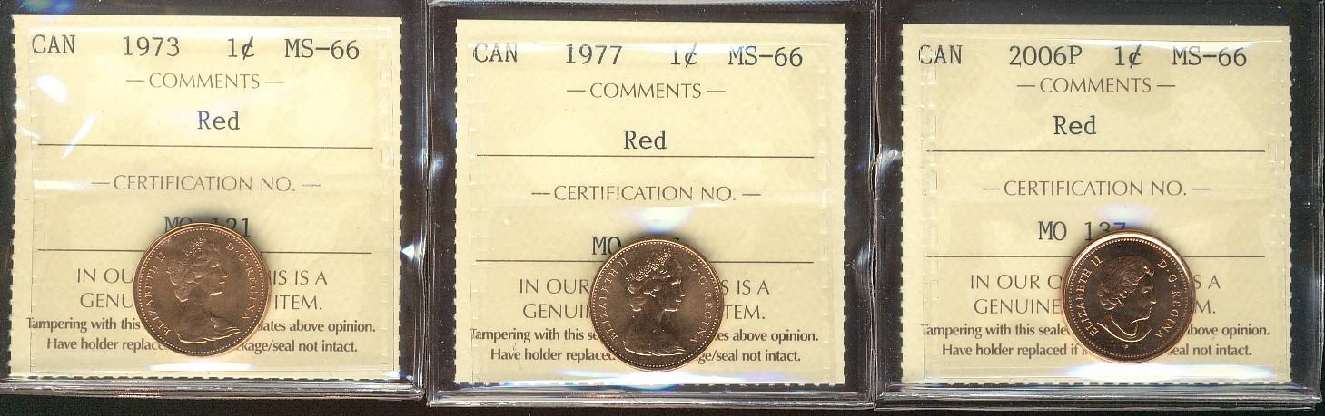 1973, 1977 & 2006P 1¢ ICCS MS66RD. Lot of 3 coins.