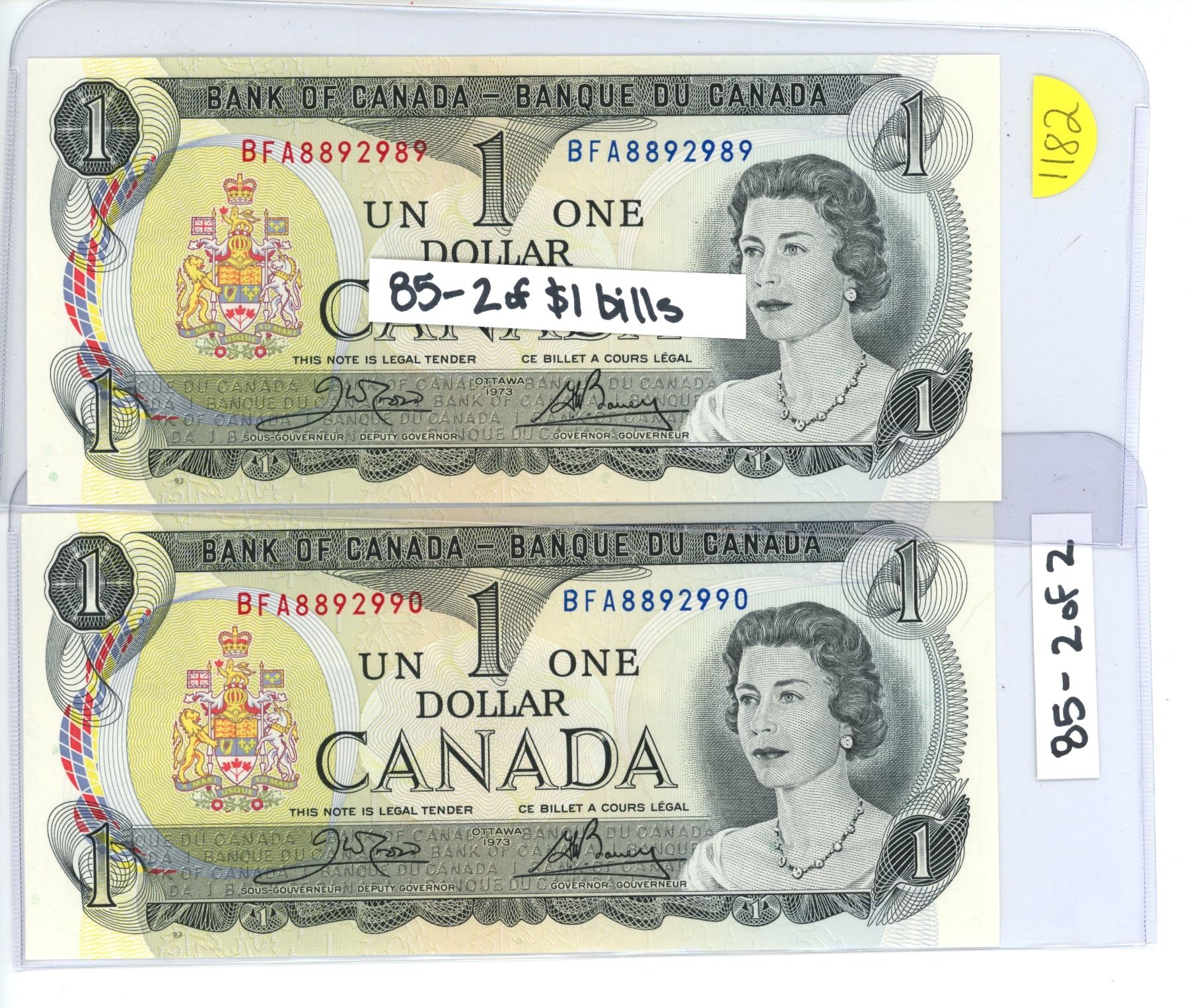 1973; 2 sequential one dollar bills (SN BFA8892989 and SN BFA8892990)