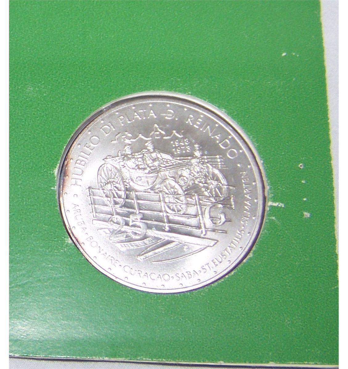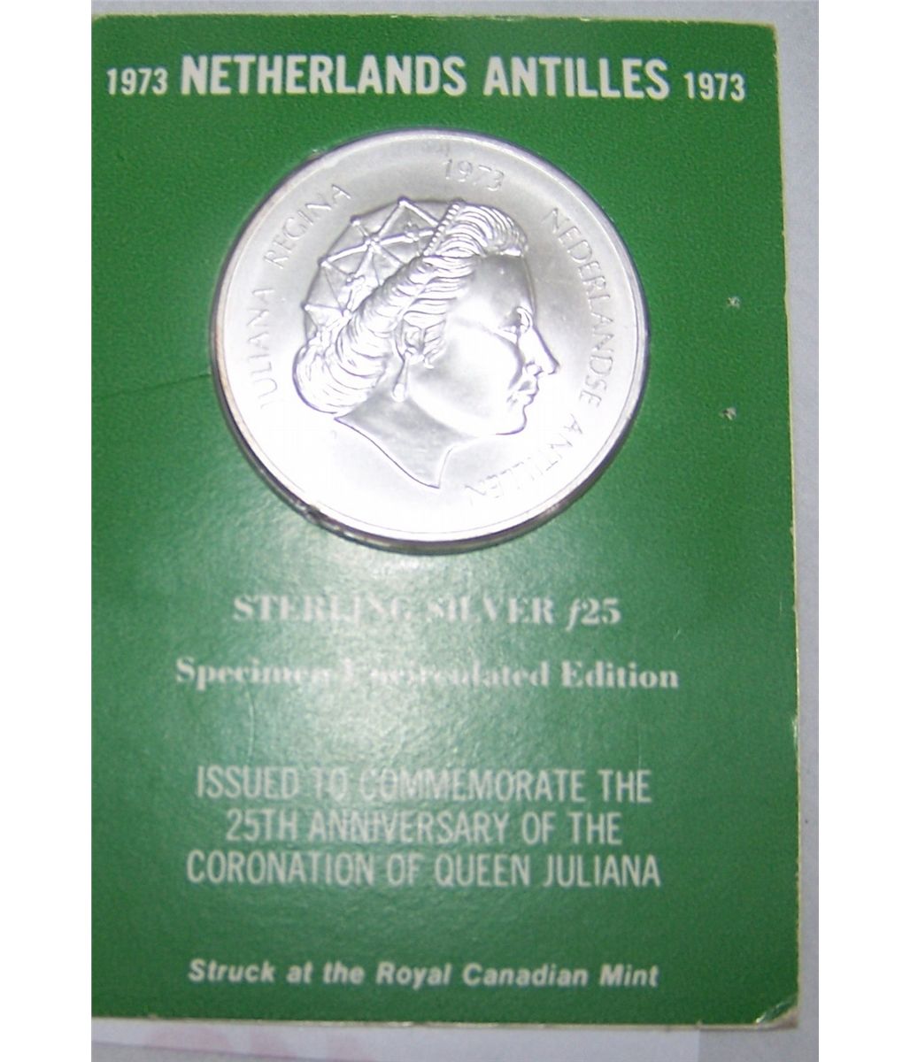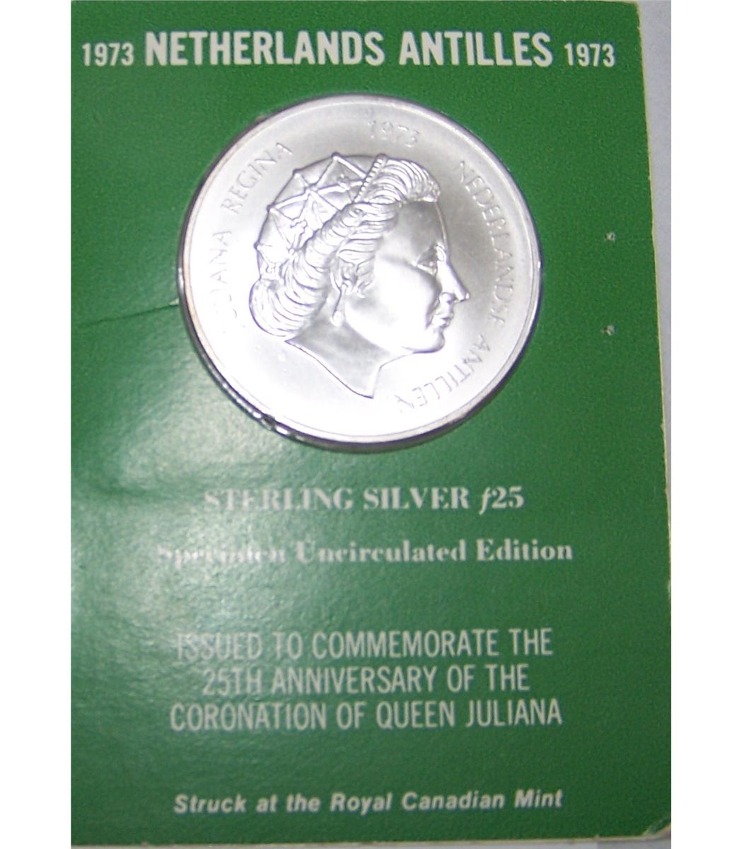 1973 25 GULDEN STERLING SILVER NETHERLAND ANTILLES COIN. 1.25 OZ. AS SHOWN. VIEW PICTURE FOR DETAIL.