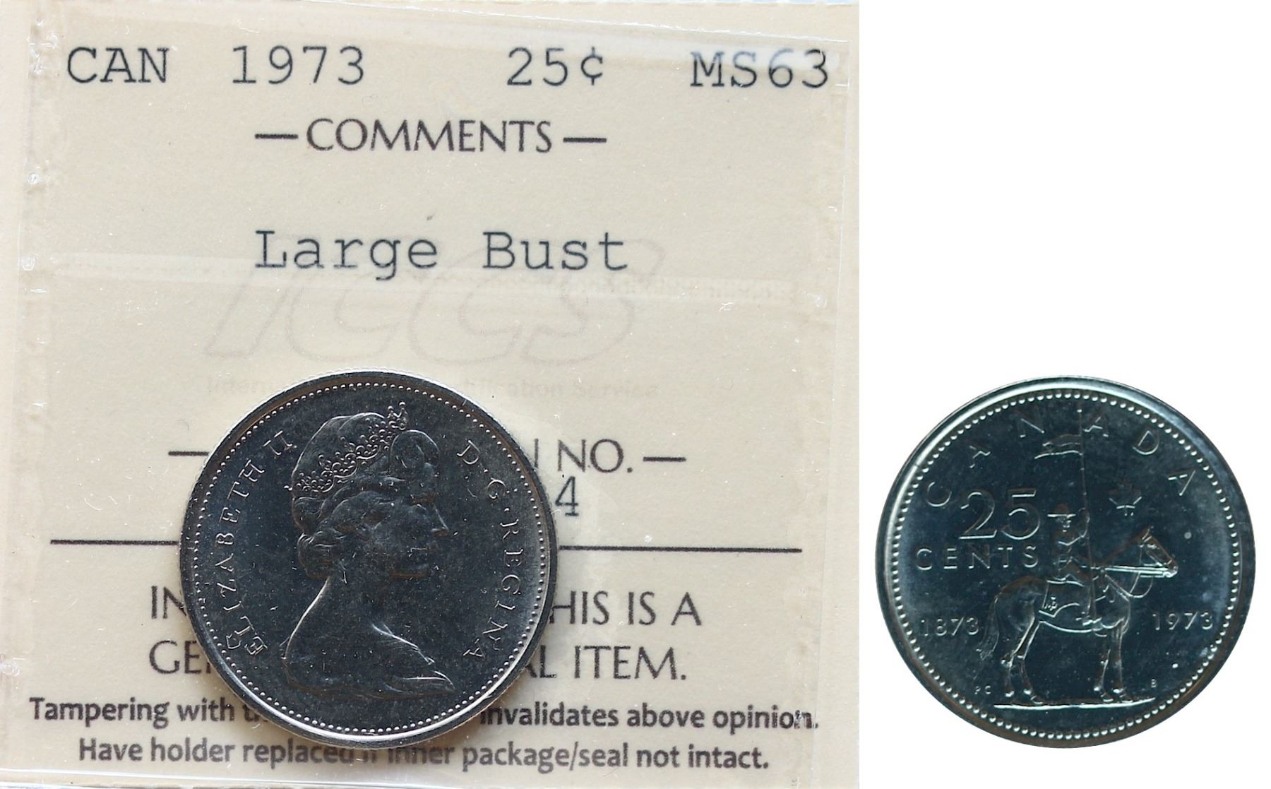 1973 25¢ "Large Bust" ICCS Choice Mint State-63. Popular issue, scarcer in MS conditions.