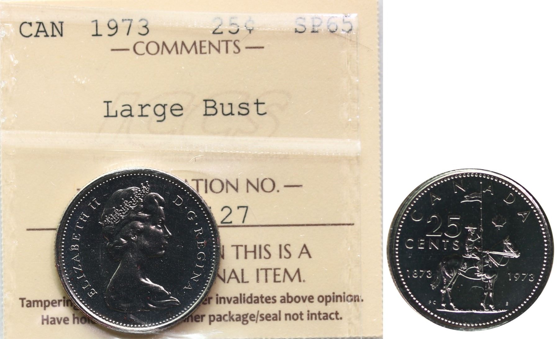 1973 25¢ "Large Bust" ICCS Gem SPECIMEN-65 Popular variety.