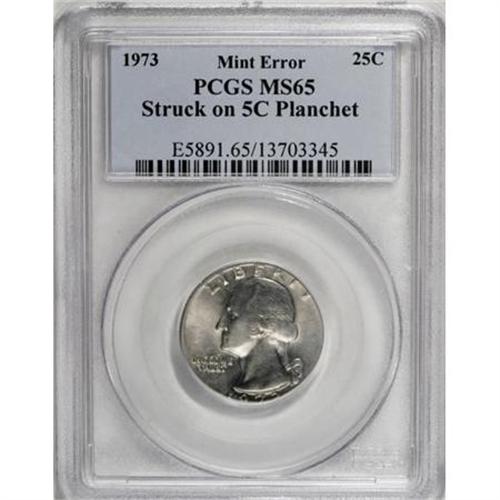 <B>1973 25C Washington Quarter--Struck on a 5C Planchet--MS65 PCGS.</B></I> <BR><BR><B>Coin Engraver:</B> John Flanagan<BR><BR><b>Shipping:</b> Coins & Currency (<a target="_blank" href="http://www.heritageauctions.com/common/shipping.php">view shipping information</a>)