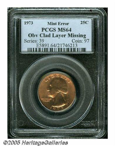 <B>1973<25C> Washington Quarter--Obverse Clad Layer Missing--MS64 PCGS.</B></I> The obverse has bright orange color, as made since the copper core is exposed. Struck without an obverse clad layer, the piece was too thin to fill the dies, thus the peripheral legends are softly struck. This lot complements the next lot, a 1973 Quarter with the reverse clad layer missing.