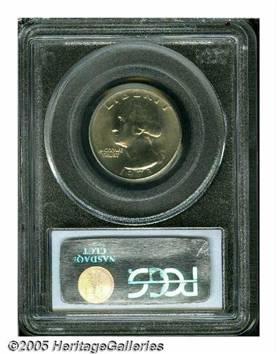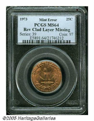 <B>1973<25C> Washington Quarter--Reverse Clad Layer Missing--MS64 PCGS.</B></I> The reverse displays rich orange-red color, since the copper core is fully exposed on that side. The planchet was presumably cut from end of roll stock that did not have a clad layer on one side. The borders are softly struck, not surprising since the planchet was too thin to completely fill the dies.