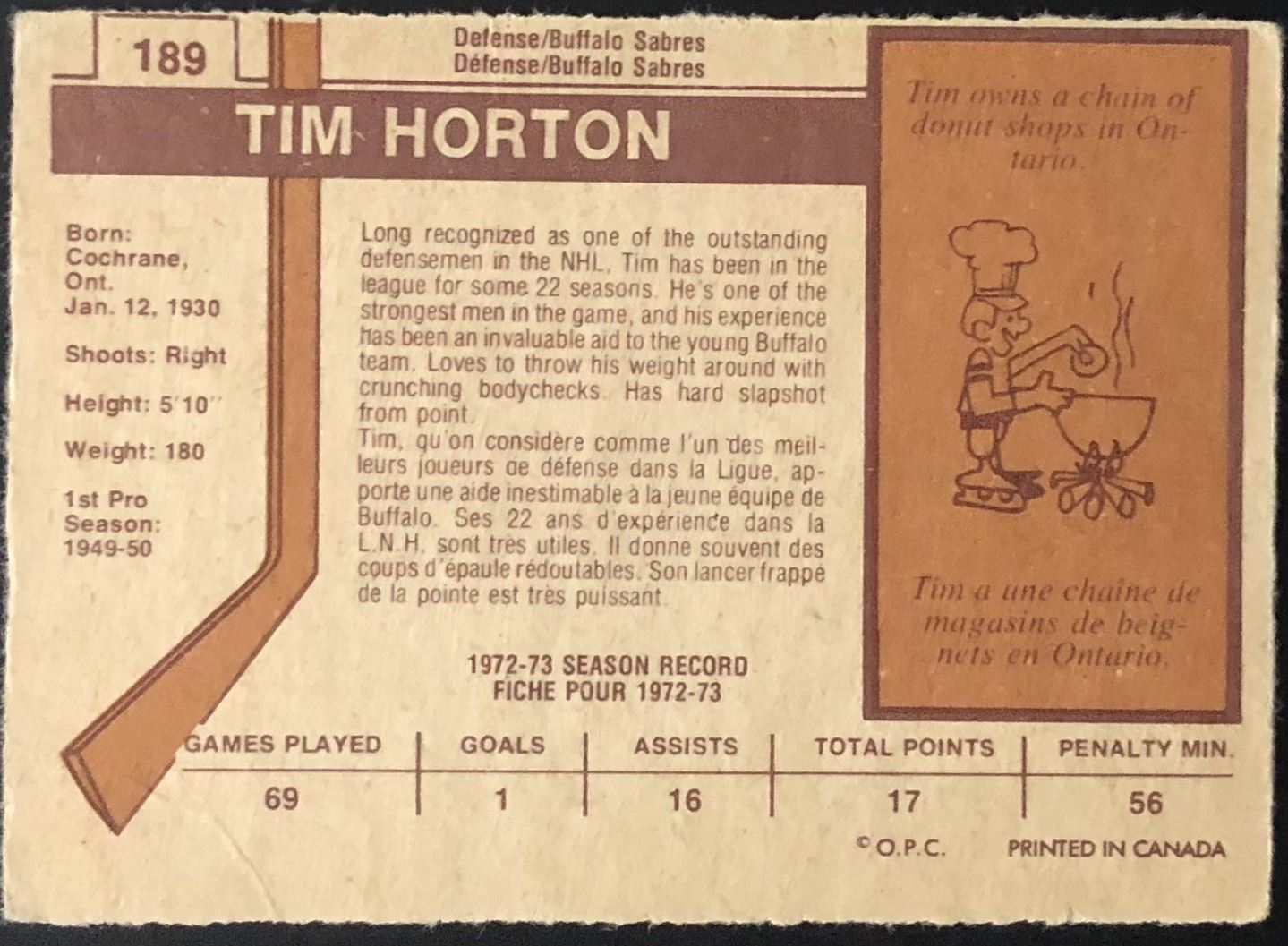 Card #189 OPC, NHL, hockey, vintage, hall of fame