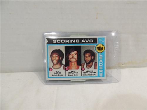 1973-74 TOPPS #145 BASKETBALL SCORING LEADERS: MARAVICH, ABDUL-JABBAR AND MCADOO. AS SHOWN. VIEW PICTURE FOR DETAIL.
