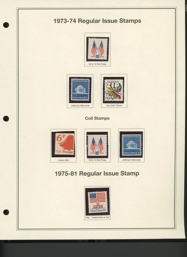 1973-74 Regular Issue Stamps: 50 & 13 Star Flags; Jefferson Memorial; Zip Code Theme; Coil Stamps: Liberty Bell; 15 & 13 Star Flags; Jefferson Memorial; 1981 Regular Issue Flag over Independence Hall Stamp
