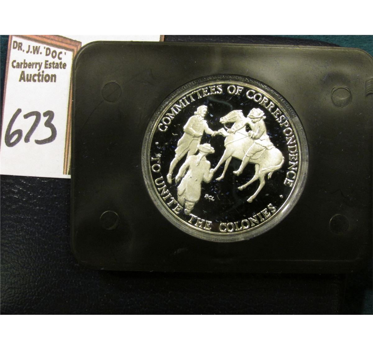 1973 American Revolution Bicentennial Commemorative Proof Sterling Silver Medalion in original felt-lined box of issue. 39mm, encased.