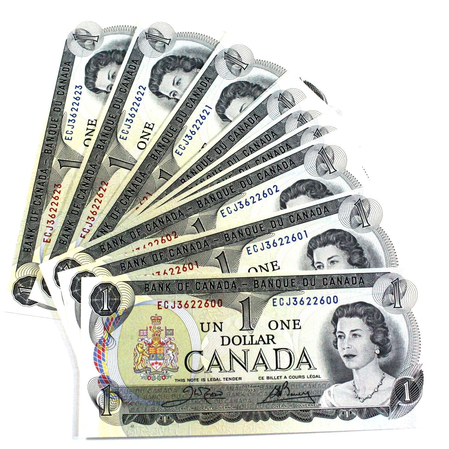 1973 BC-46b Bank of Canada $1 Notes Crow-Bouey Signatures with Consecutive Serial Numbers ECJ3622600-623. 24pcs