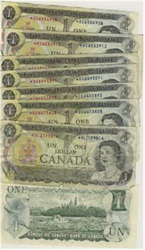 8 circulated asterisk replacement notes, mostly VG to VF. Lawson-Bouey variety; 1 note *OL2199016 with tear at bottom centre, tatter along top border and soiled from handling. 7 miscellaneous serial numbers with *OG prefix, no return.