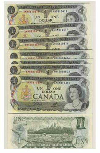 18 fresh crisp unc notes, sequential serial numbers AMH5810601-AMH5810618. Crow-Bouey signature. Last year of issue for the one dollar notes before they were replaced by the Loonie, no return.