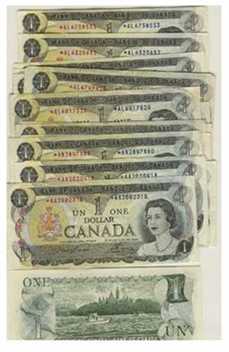 19 asterisk replacement notes; Lawson-Bouey signature. Miscellaneous serial numbers with *AA; *AL; and *AN prefix. Average circulated VG-aEF with 1 note in unc *AL6578213. BC-46aA, no return.