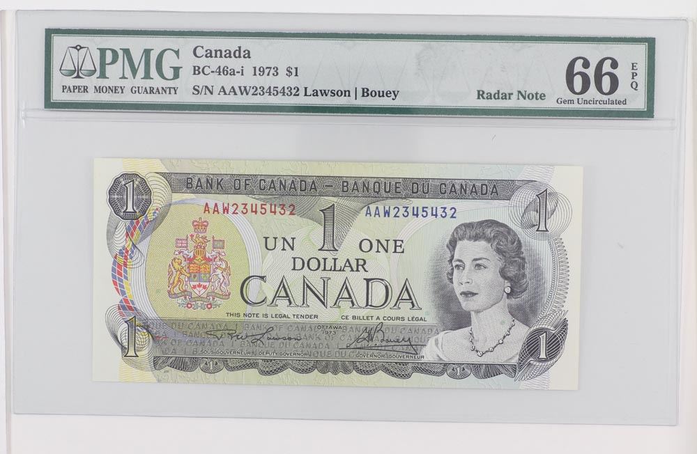 1973 Bank of Canada Ascending/Descending RADAR $1. BC-46a-i, S/N: AAW2345432, PMG GUNC-66, EPQ. A well centered and original example of a scarce serial number.