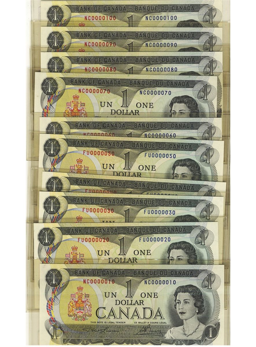 1973 Bank of Canada; BC-46a #0000010, 020, 030, 040, 050, 060, 070, 080, 090 & 100 Set. Lot of 10 no