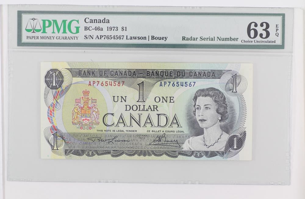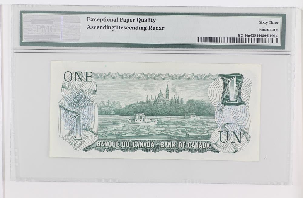 1973 Bank of Canada Descending/Ascending RADAR $1. BC-46a, S/N: AP7654567, PMG CUNC-63, EPQ
