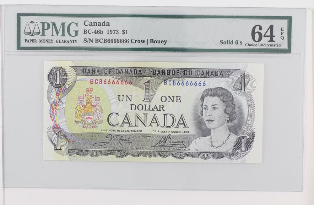 1973 Bank of Canada Solid digit RADAR $1. BC-46b, S/N: BCB6666666, PMG CUNC-64, EPQ