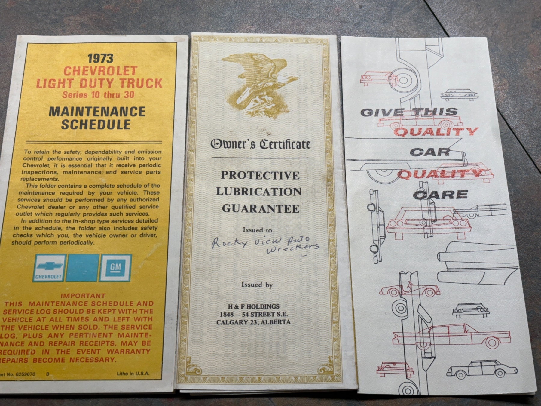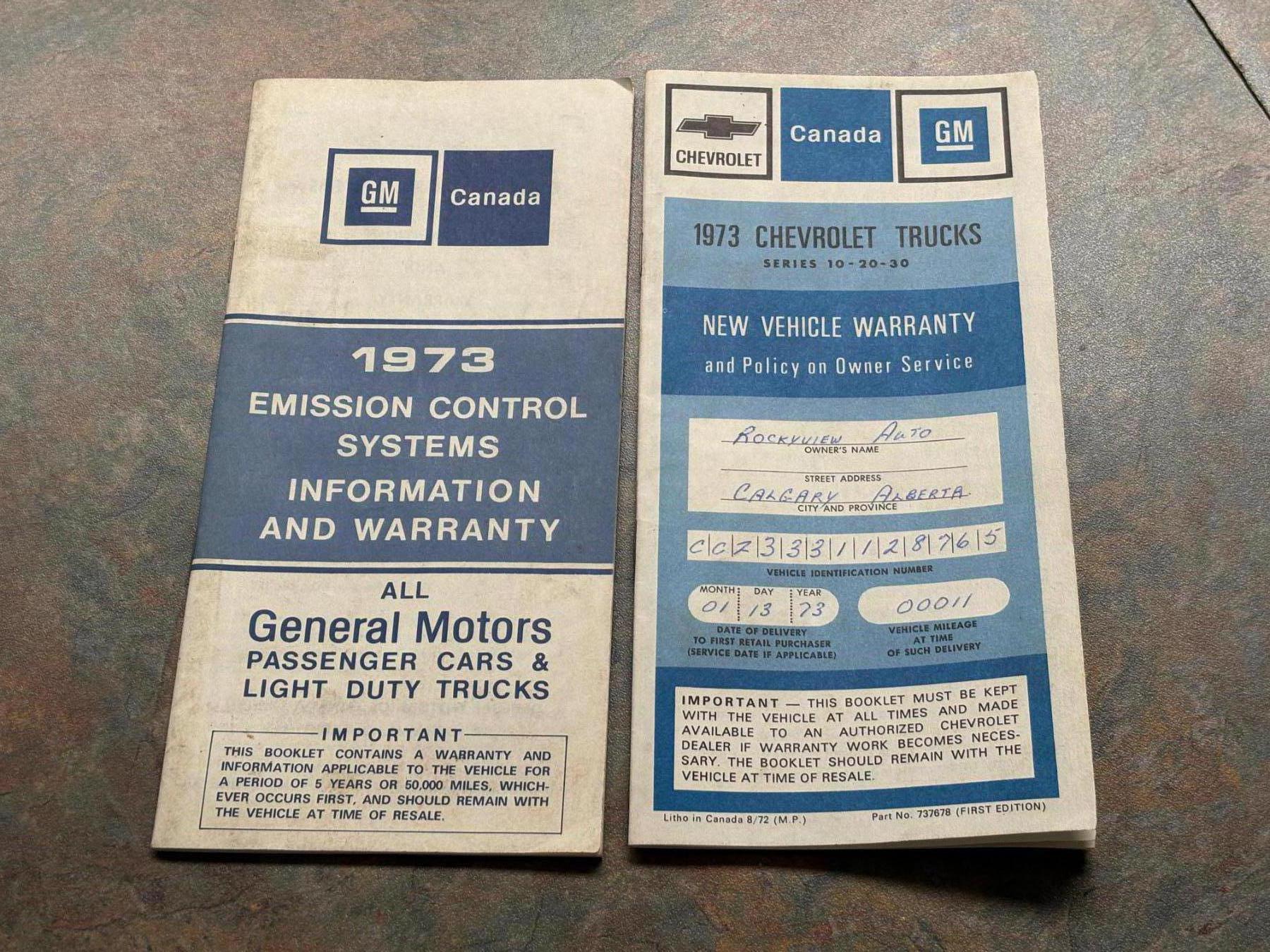 Original 1973 car record holder with original owner’s name on the packet. Original 1973 Chevrolet light duty truck maintenance schedule. Original owner certificate protective lubricant issued by HNF holdings in Calgary Alberta. Original 1973 Chevrolet trucks new vehicle warranty dated January 13, 1973. And original emission control systems, information and warranty booklet. comes with it an original field sheet window sticker still on the inside fender.
