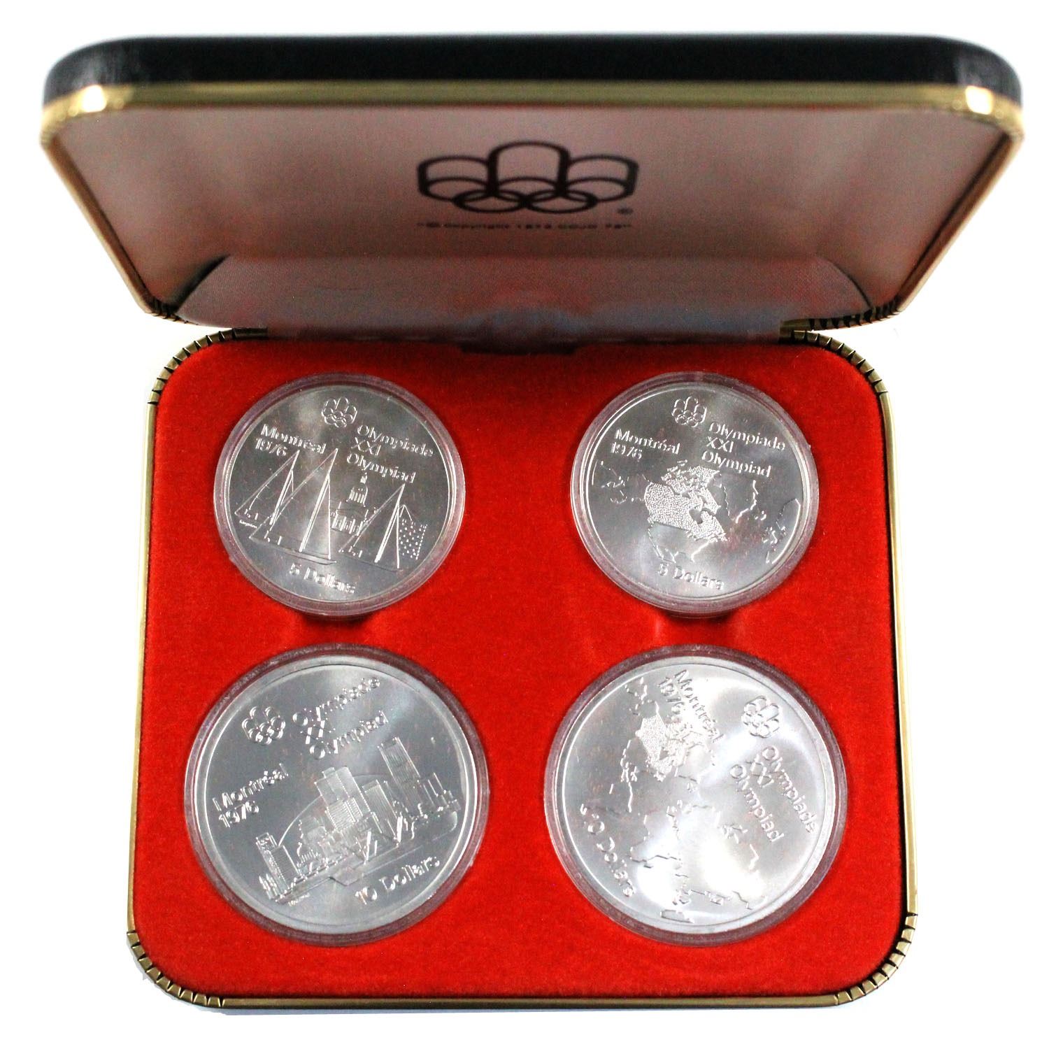 1973 Canada Montreal Olympics $5 & $10 4-coin Sterling Silver Set in Original leatherette display .