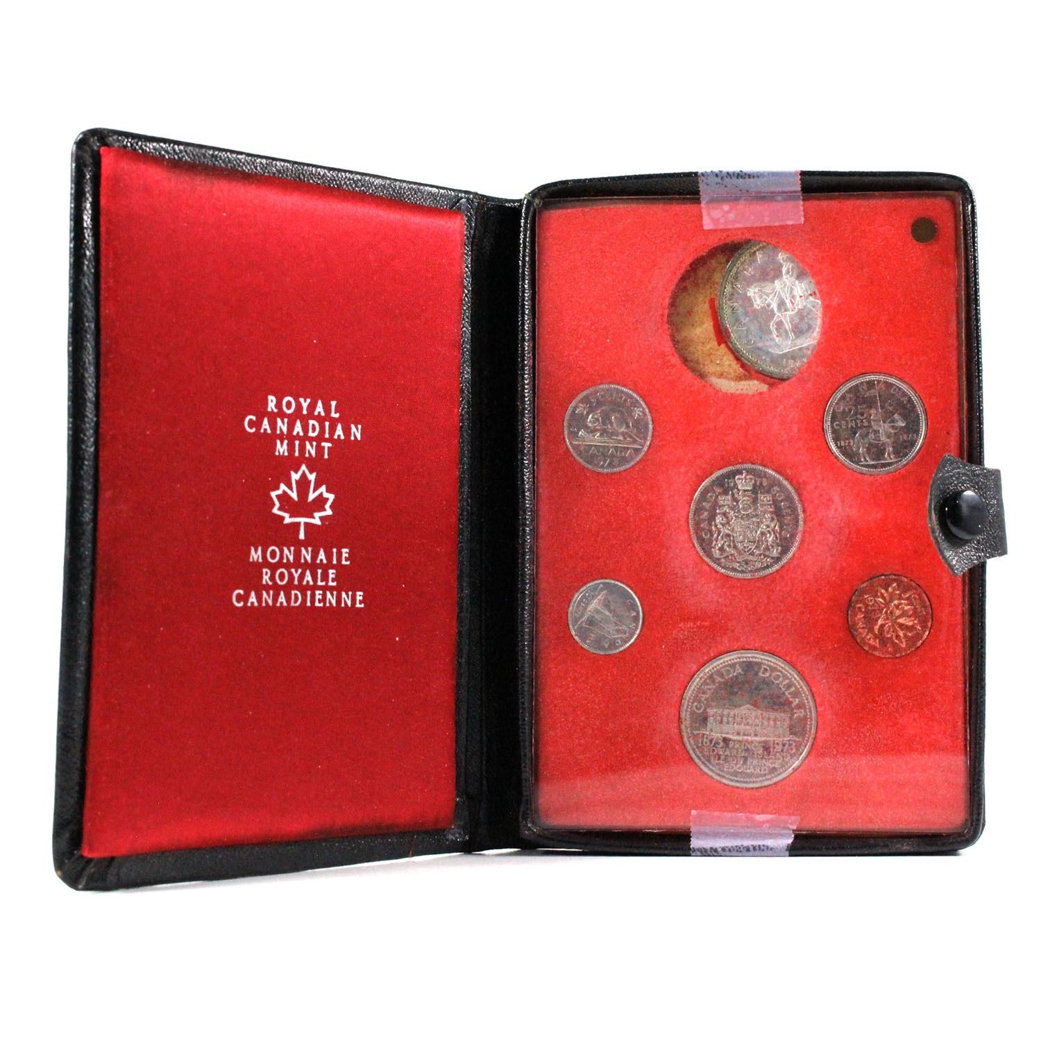 1973 Canada Specimen Double Dollar Set. coins are toned/felt disturbed, packaging showing sign of aging.