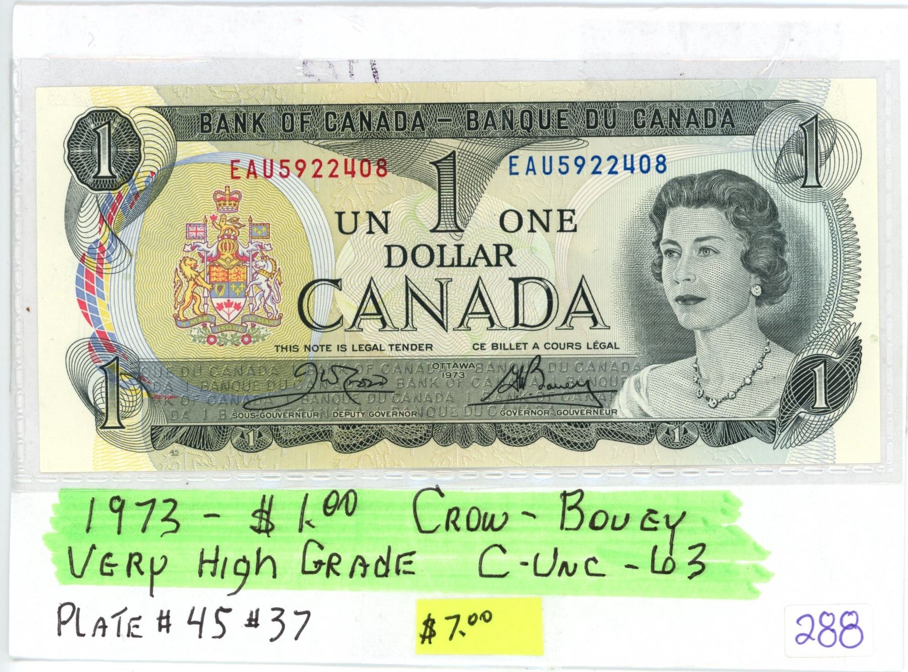 1973 Canadian $1.00 One Dollar Bill Crow-Bouey signatures