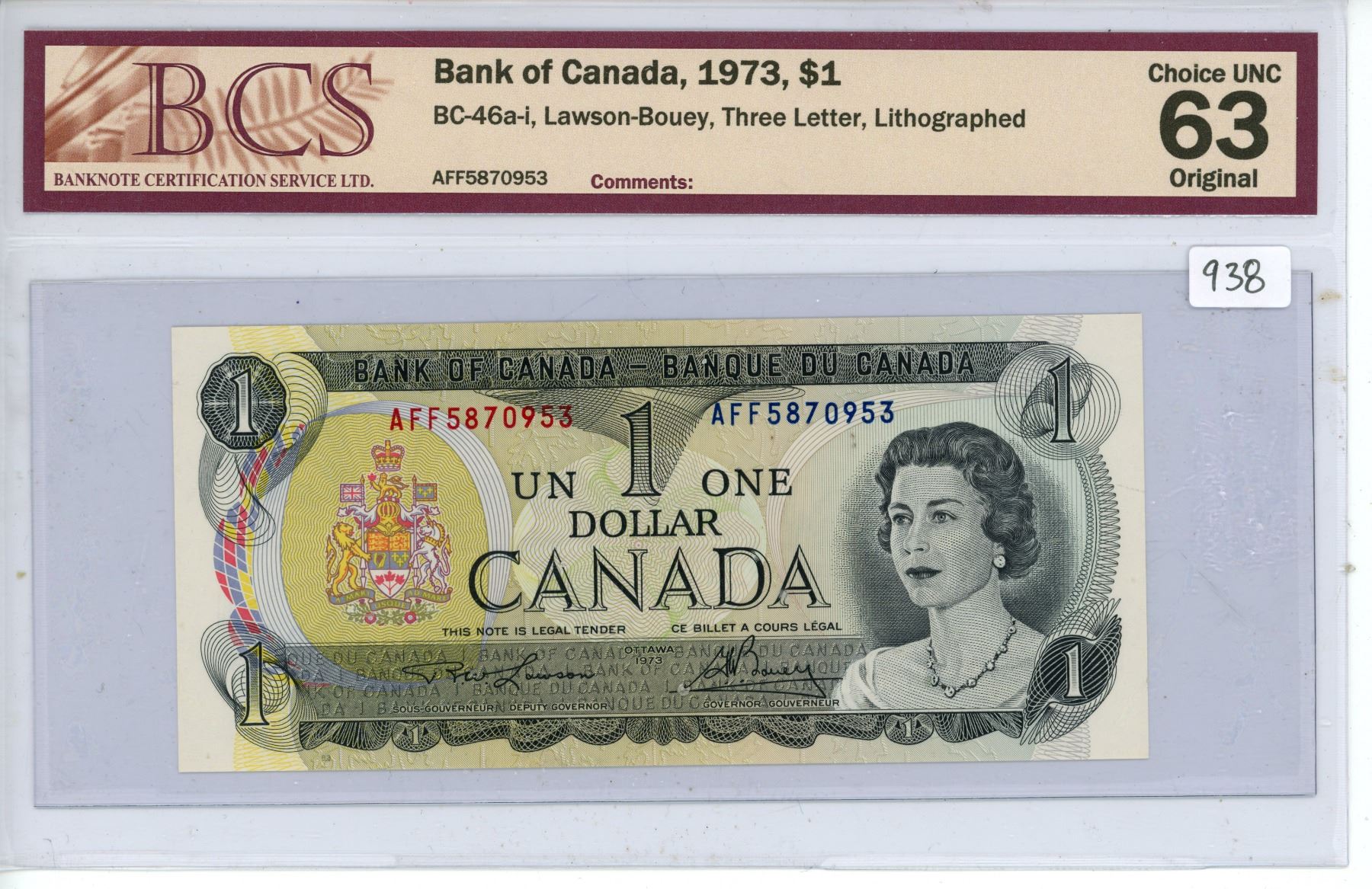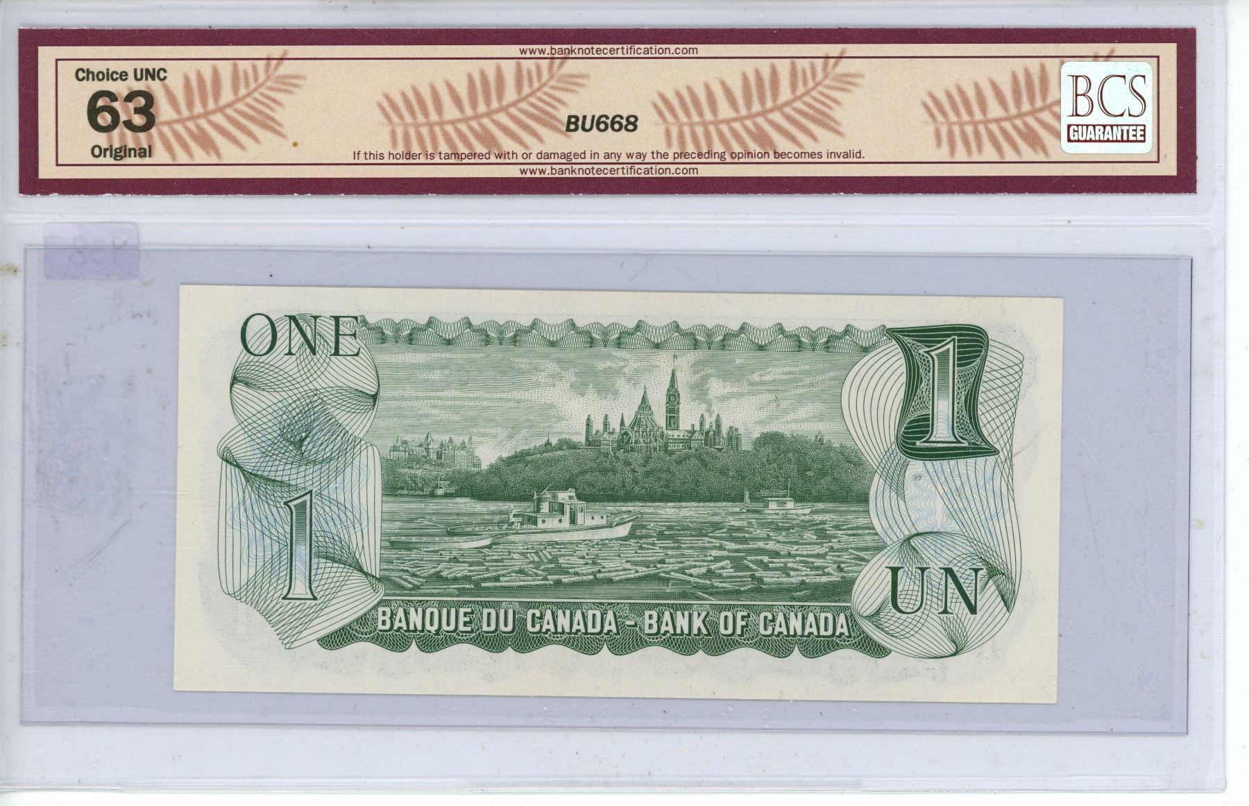 1973 Canadian $1 Bill - BCS Graded, Three Letter, Lithographed, Choice UNC 63