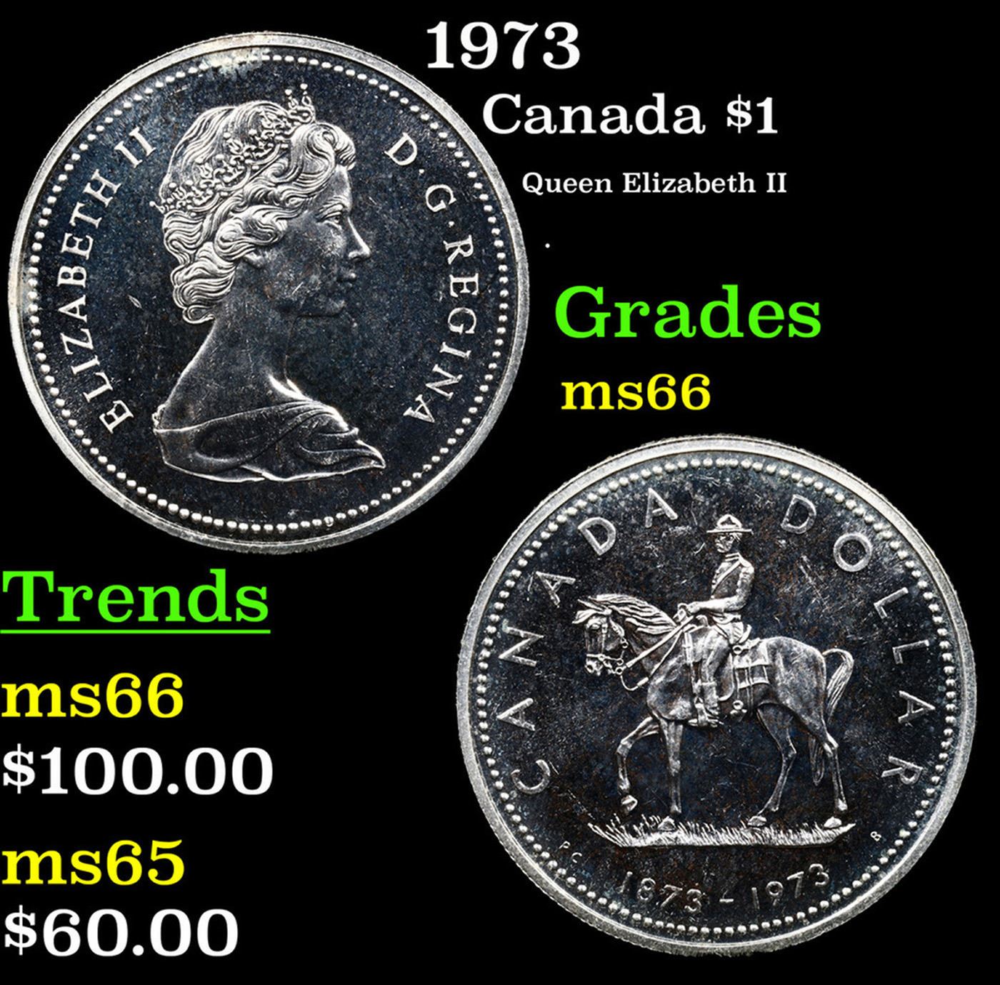 1973 Canadian Dollar $1 Grades GEM+ Unc Elizabeth was born in Mayfair, London, as the first child of the Duke and Duchess of York (later King George VI and Queen Elizabeth). Her father acceded to the throne in 1936 upon the abdication of his brother, King Edward VIII, making Elizabeth the heir presumptive. She was educated privately at home and began to undertake public duties during the Second World War, serving in the Auxiliary Territorial Service. In November 1947, she married Philip Mountbatten, a former prince of Greece and Denmark, and their marriage lasted 73 years until Philip's death in 2021. They had four children: Charles, Prince of Wales; Anne, Princess Royal; Prince Andrew, Duke of York; and Prince Edward, Earl of Wessex.