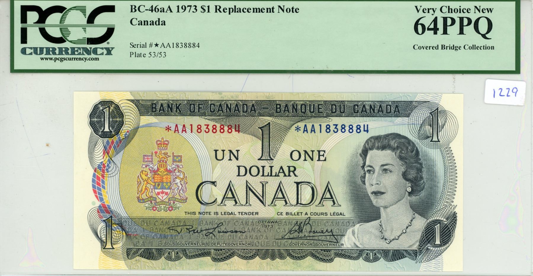 1973 Canadian Replacement $1 Bill - PCGS Graded, Very Choice New 64PPQ