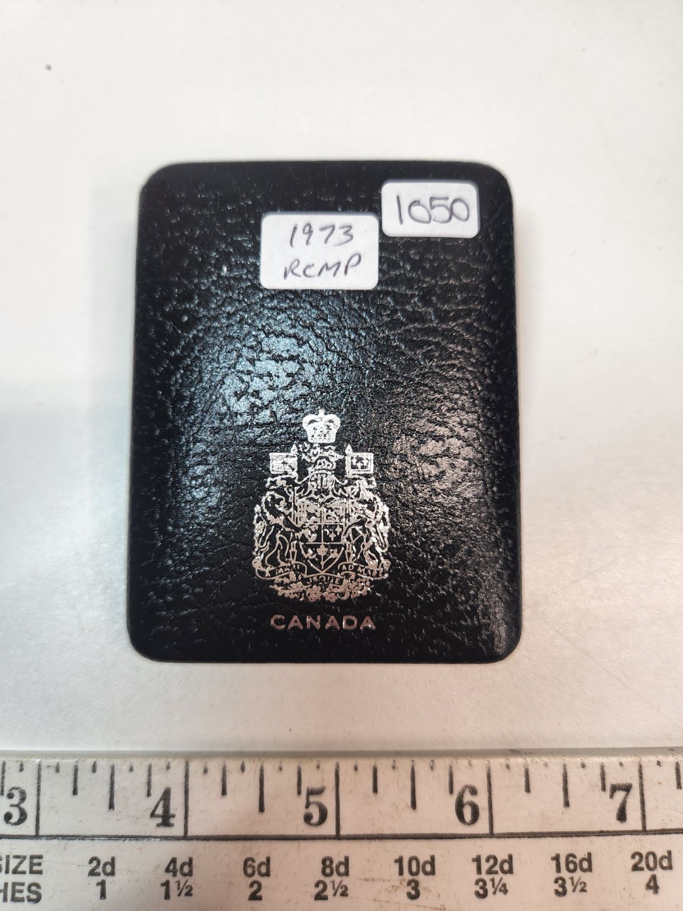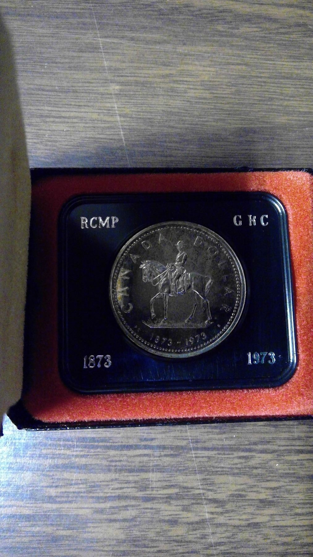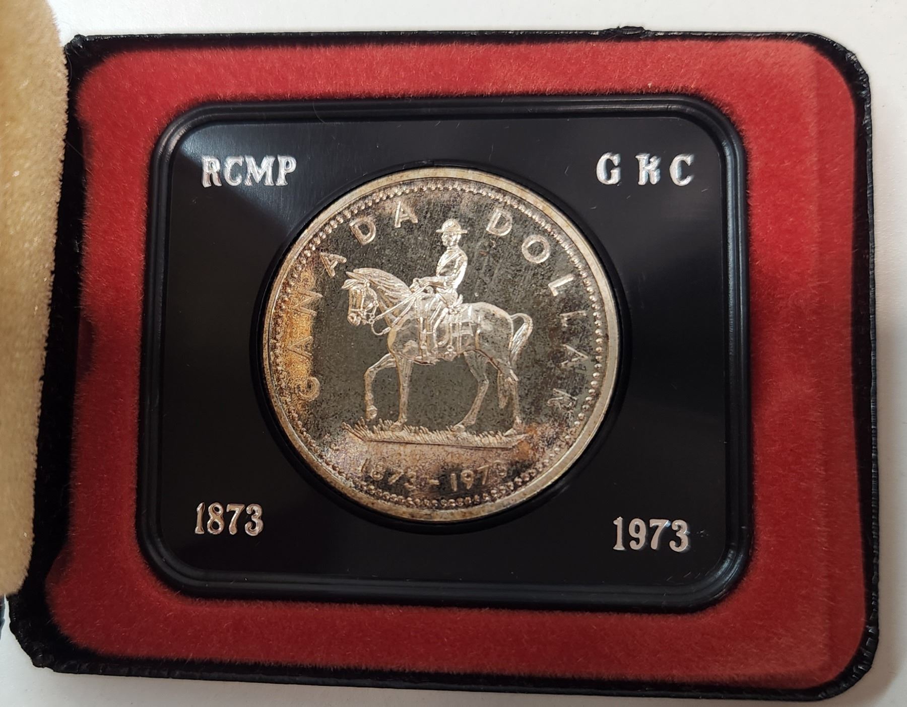 1973 Canadian Silver Dollar. Commemorates the 100th Anniversary of the RCMP. Specimen. Nicely Toned. Housed in its original black clamshell case.