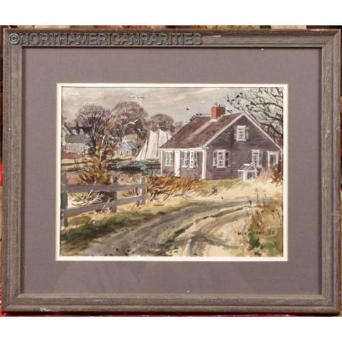 /init_item.jsp?id=1120471&recordNo=11#watercolor depicting an old Cape Cod style house by a lake landscape, fence and dirt road in foreground with sail boat, trees and houses in background. Piece looks like Cape Cod area, New England area. <p> Framed in 14" x 17" wood frame, double matted under glass. Signed and dated in watercolor lower right corner.