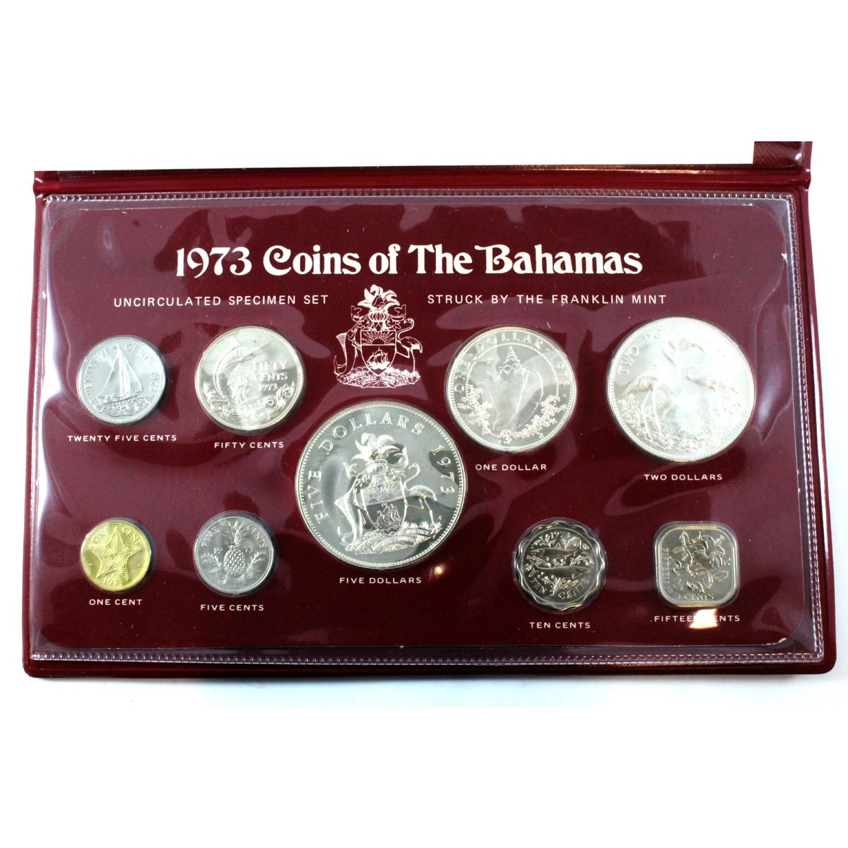 1973 Coins of the Bahamas 9-coin Uncirculated Franklin Mint Specimen Set. Buyers Premium will be added on all items as per our terms of sale. We accept Paypal, Credit Card, E-Transfer Payments, Cheque or Money Orders (there is an additional 3% fee for using Paypal or Credit Card). All invoices will be emailed immediately following the auction, please contact us if you would like to pay by credit card or receive a new revised lower total for mailing in payment or sending an e-transfer (3% discount). All Items Are Sold "AS IS", no returns