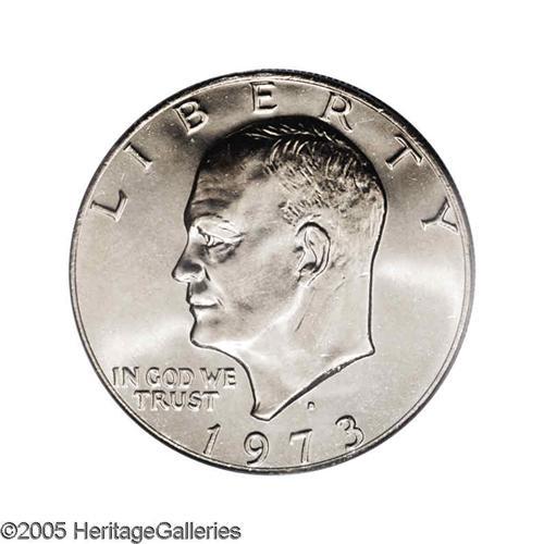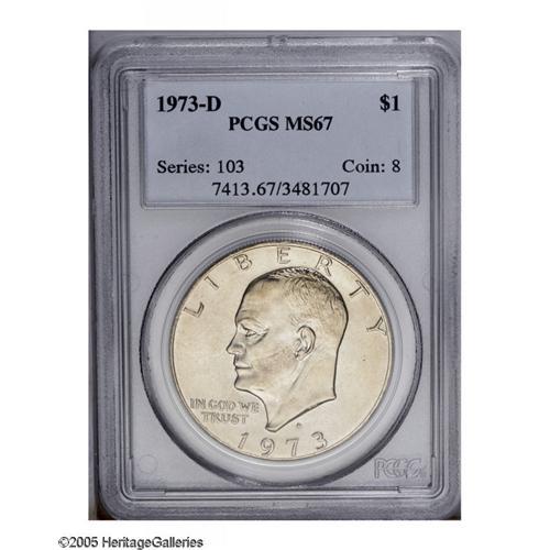 <B>1973-D<$1> MS67 PCGS.</B></I> A sensational example of this issue, a date that is almost never seen nice. The Eisenhower Dollars for the year were never sent to circulation, and were only sold in Mint and Proof Sets. Quality was not all that good, and it is only through the submission of large quantities of these coins that an occasional Superb Gem example appears in the market.