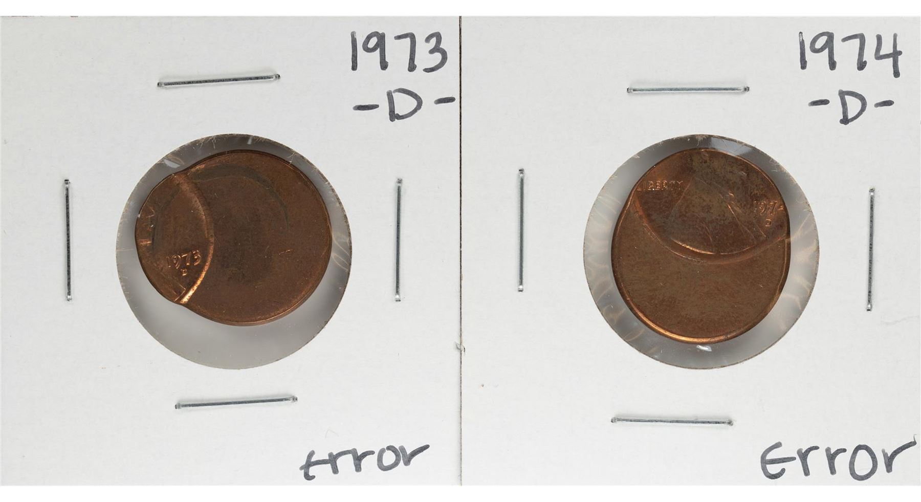 One 1973-D & 1974-D Lincoln Cent with Off Center Strike Error Coins.