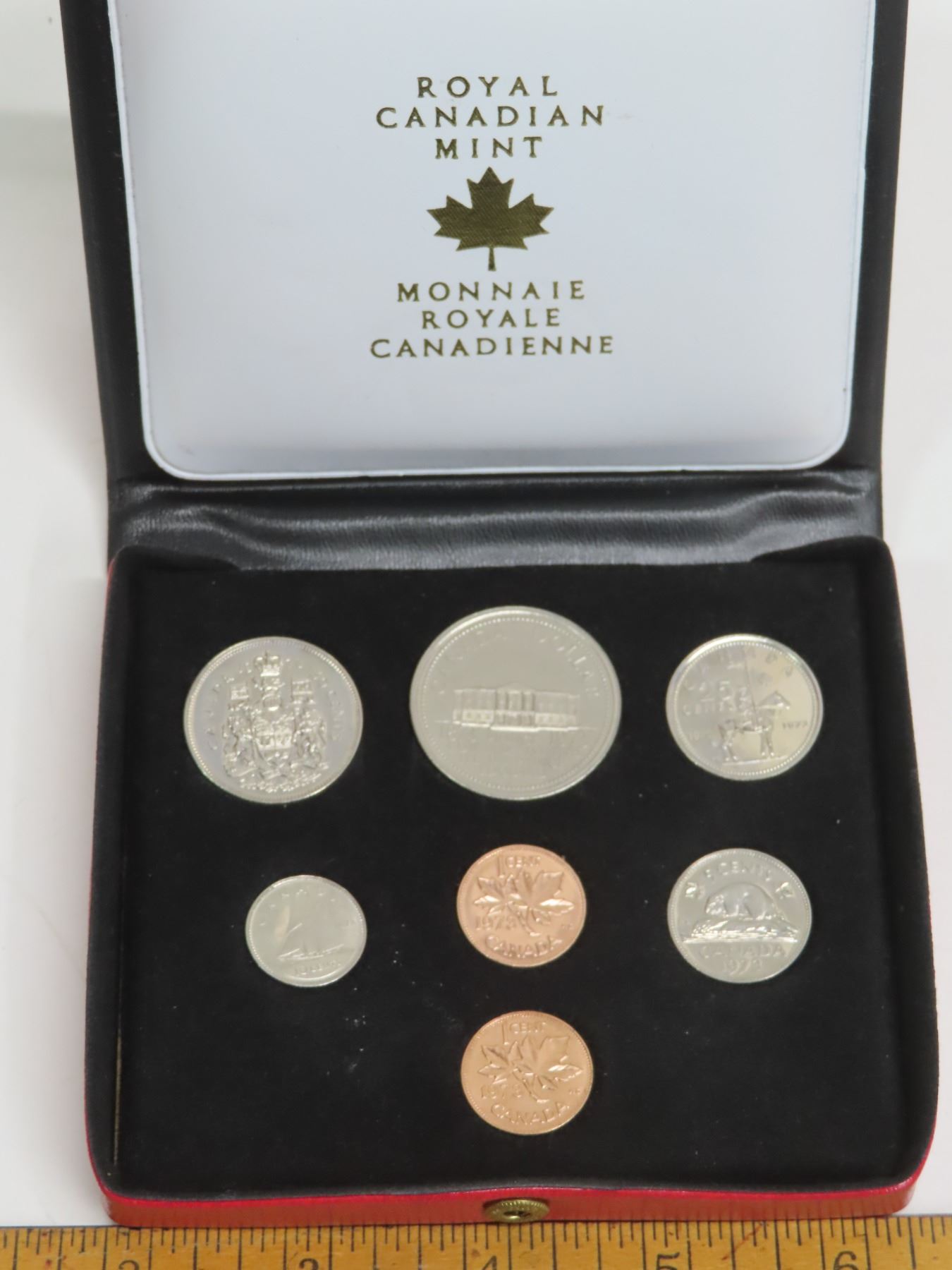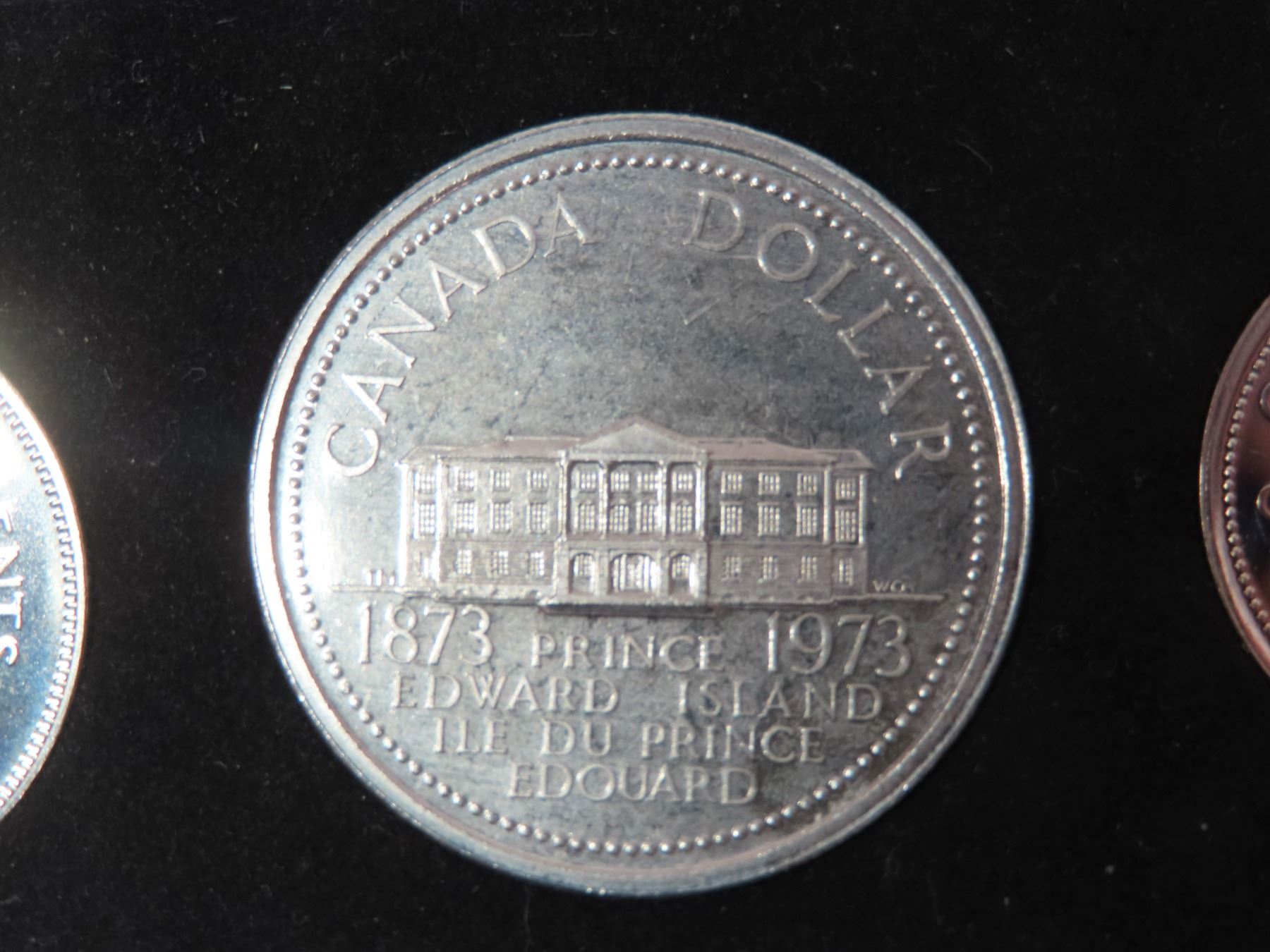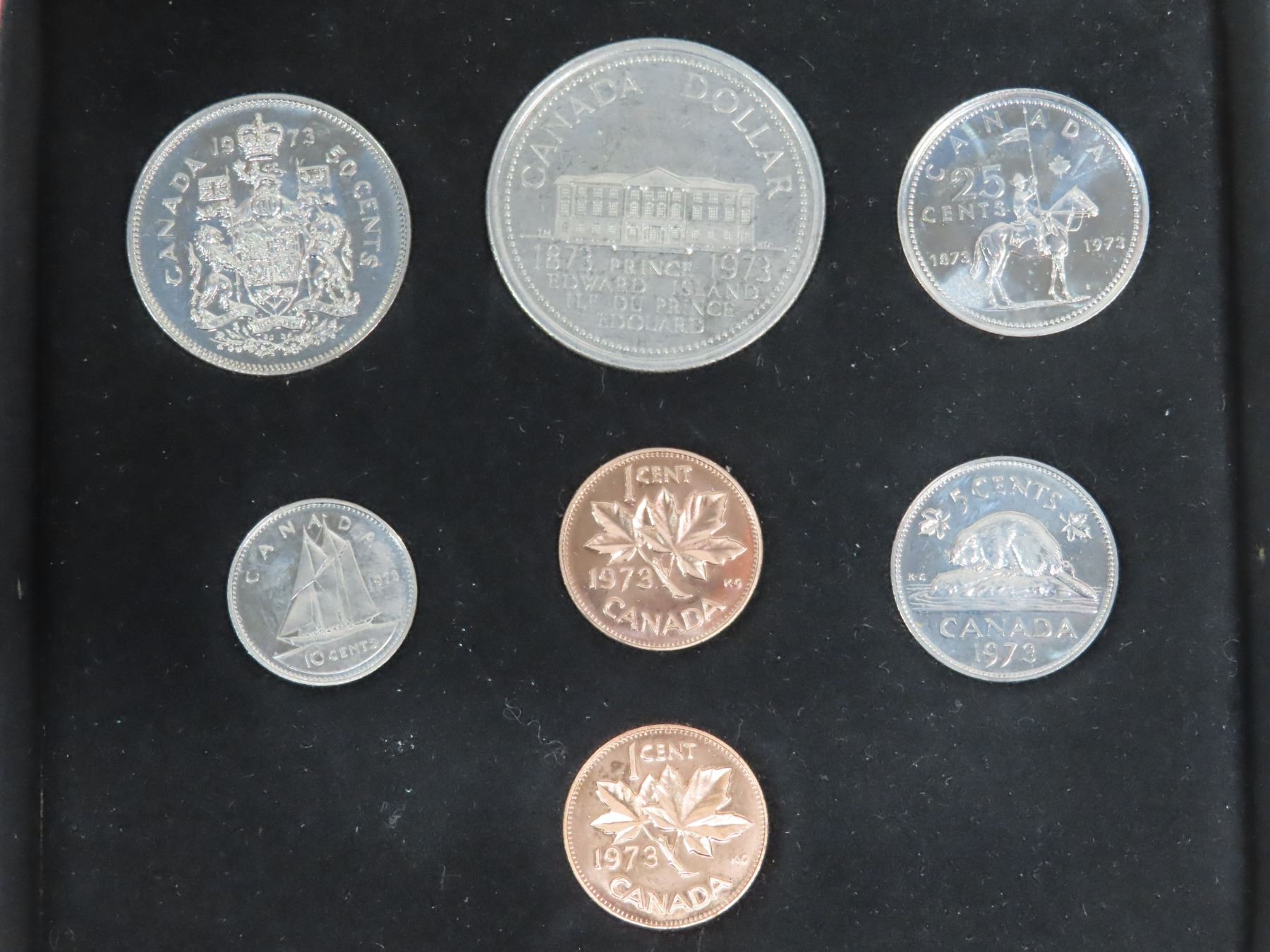1973 Double Cent Custom Set. 7-coin set includes RCMP 25 Cents & PEI Dollar. Housed in a RCM red case with Coat of Arms & Canada stamped in gold.