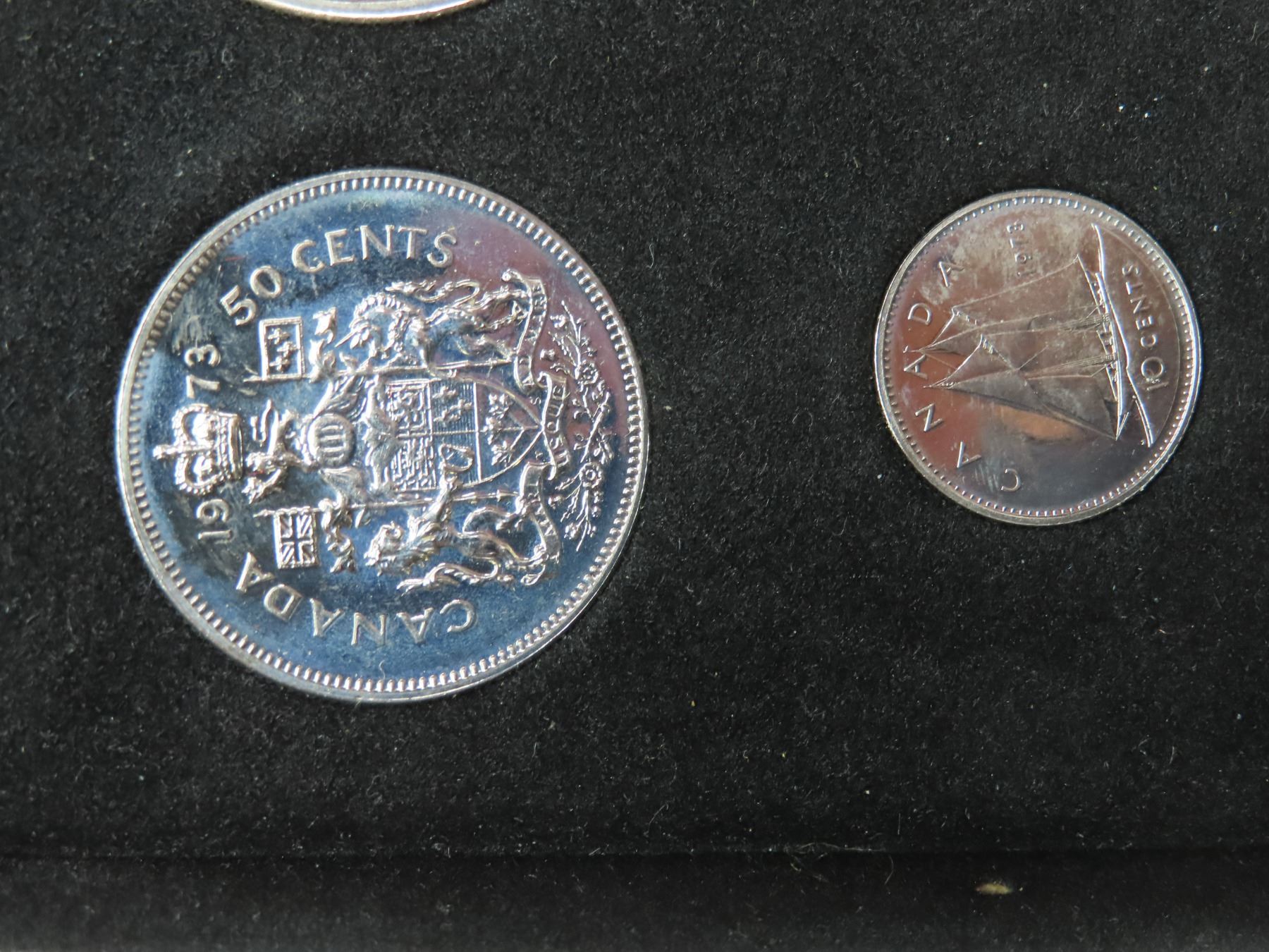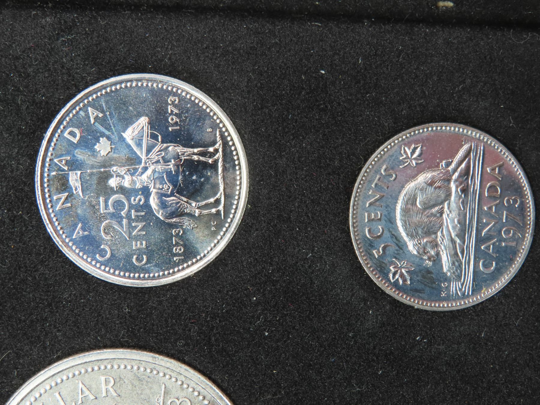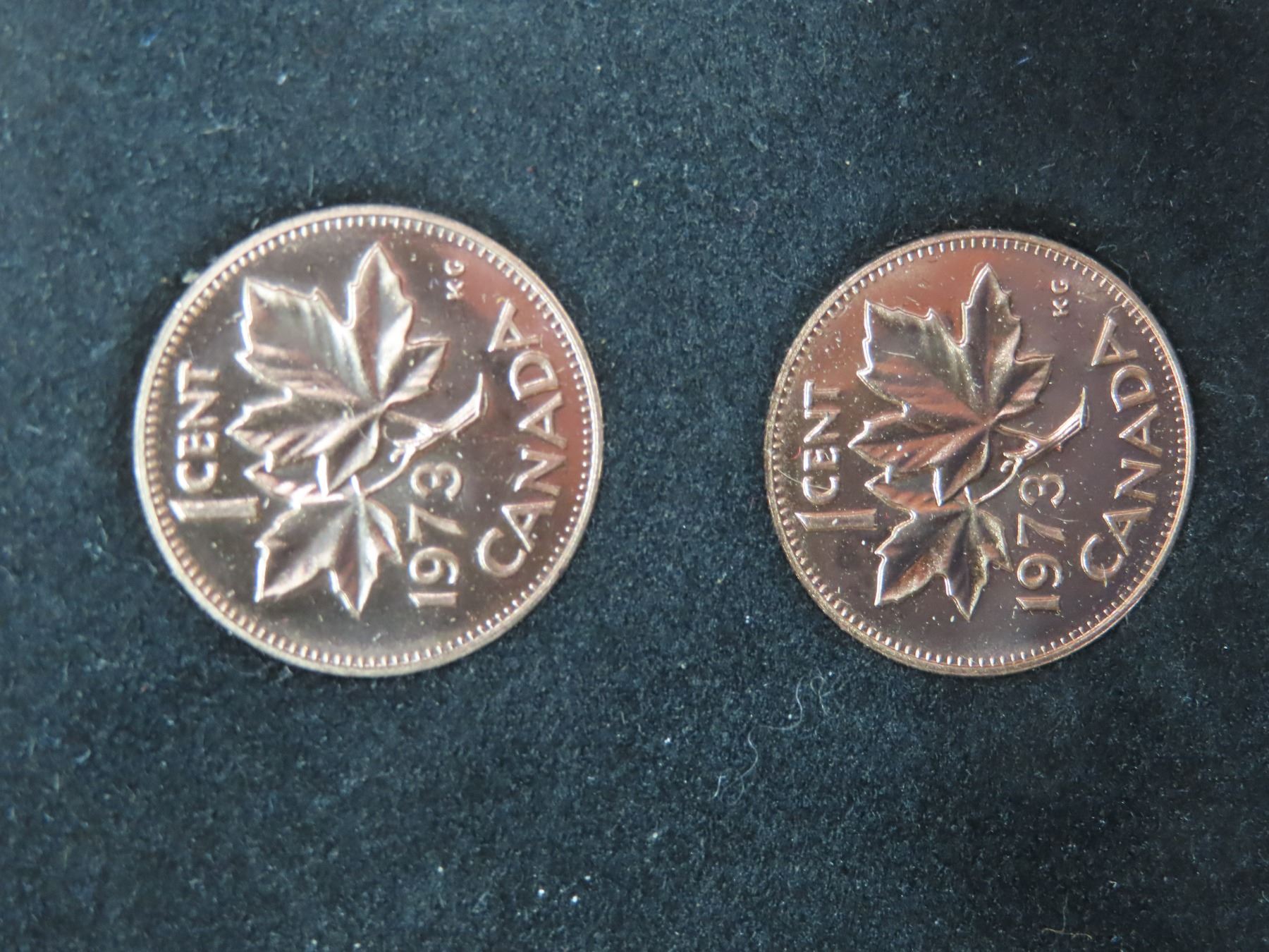1973 Double Cent Custom Set. 7-coin set includes RCMP 25 Cents & PEI Dollar. Housed in a RCM red case with Coat of Arms & Canada stamped in gold.