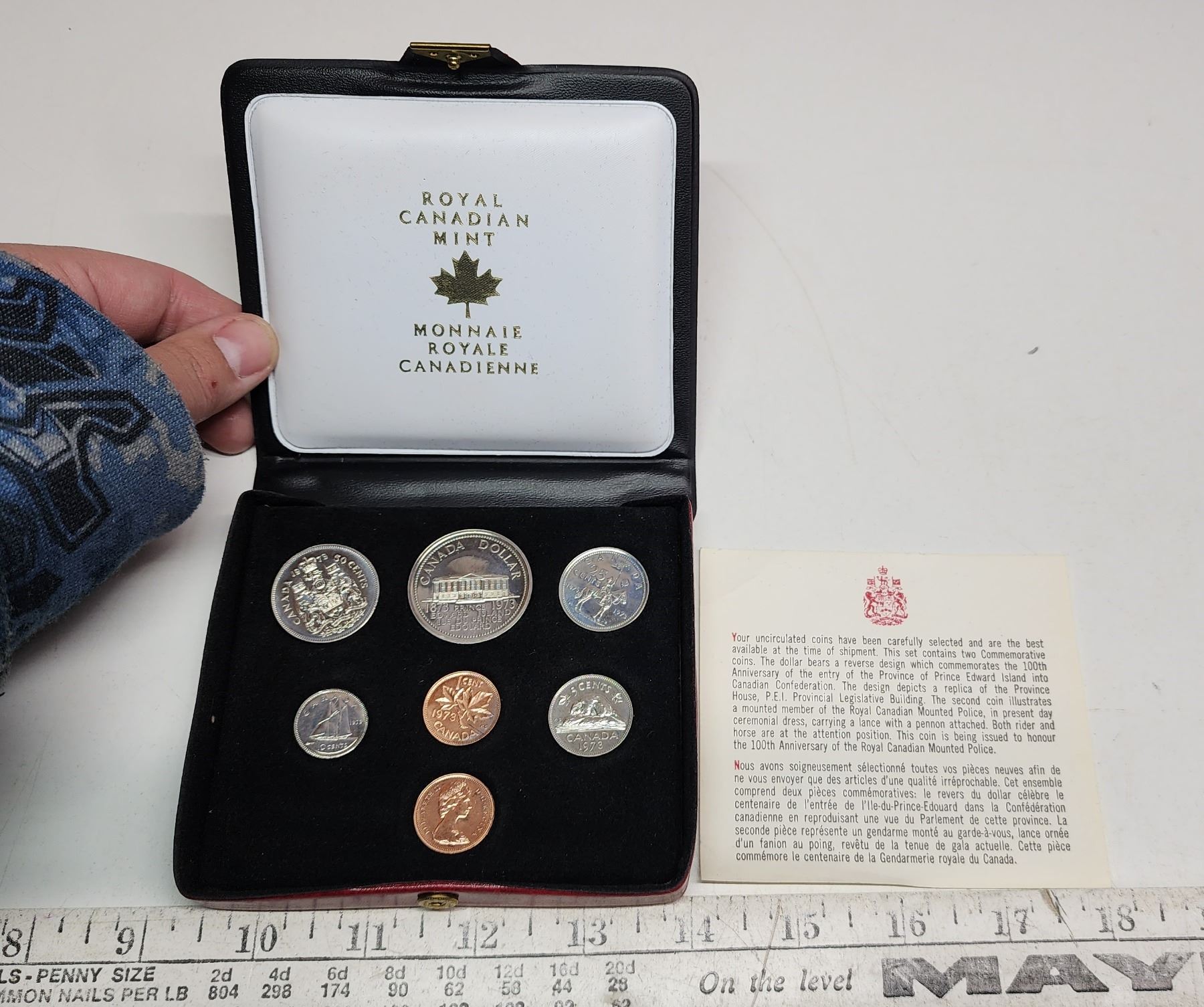 1973 Double Cent Nickel Custom Set. 7-coin set includes 2 Cents. Mintage of 49,376. Housed in its red case of issue with Canada’s Coat of Arms & CANADA stamped in gold.