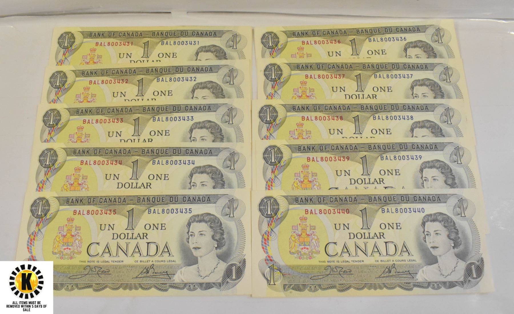 1973 LOT OF 10 IN SEQUENCE CANADA $1 DOLLAR NOTES