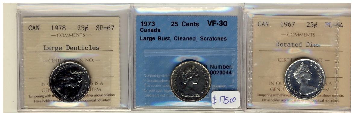 1973 Large Bust 25¢ CCCS VF30 designated as cleaned with scratches, 1967 25¢ PL64 Rotated dies and 1978 25¢ Lg Dent ICCS SP67.