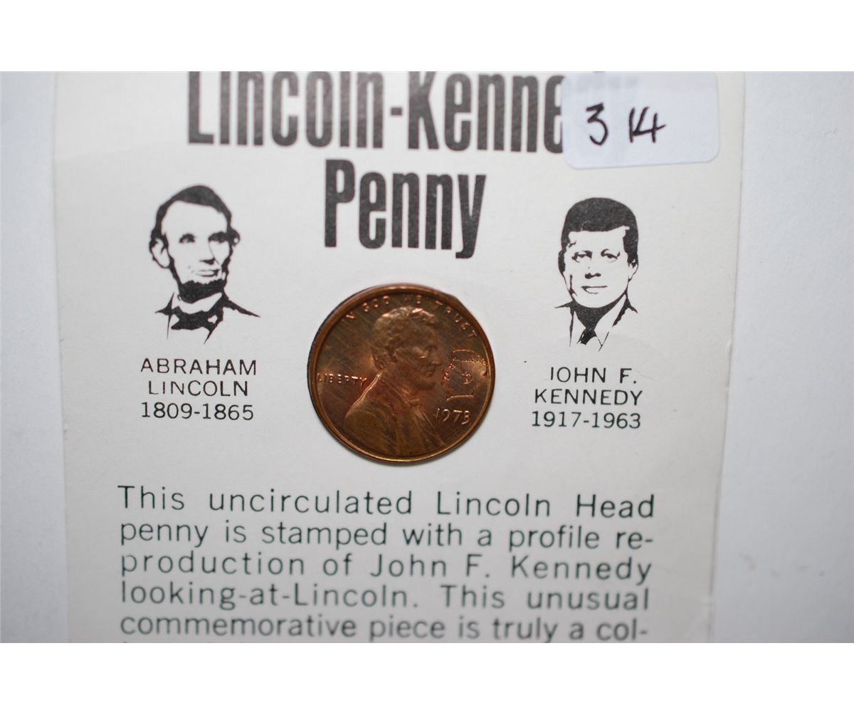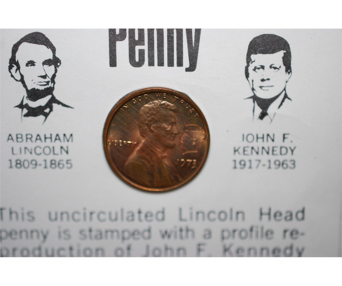 1973 Lincoln Penny With Kennedy Profile Imprinted On Front Of Coin With History; EST. $5-10