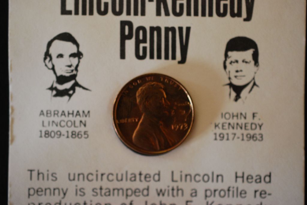 1973 Lincoln Penny With Kennedy Profile Imprinted On Front; With History Attached; EST. $2-5