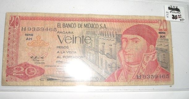1973 MEXICO 20 VEINTE PESOS SERIAL # H9359465 BANK NOTE!! NOTE CAME OUT OF SAFE!! ***Coin, Currency & All Items Listed in this auction - Grades, Conditions and Values are not Safe Deposit Coins LLC Responsibilty. Grades, Condition and Values are determined by Consigner(s) & Buyers ONLY***