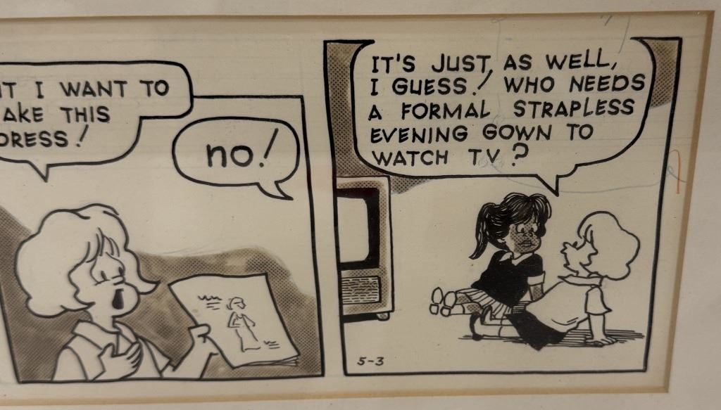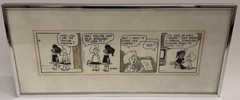 Item/Description: Framed 1973 vintage Wee Pals comic strip by Morrie Turner (American, 1923-2014) involving whimsical sewing humor between two friends and a mother. Copyrighted King Features Syndicate Inc., 1973. Lew Little Syndicate. 5-3.
